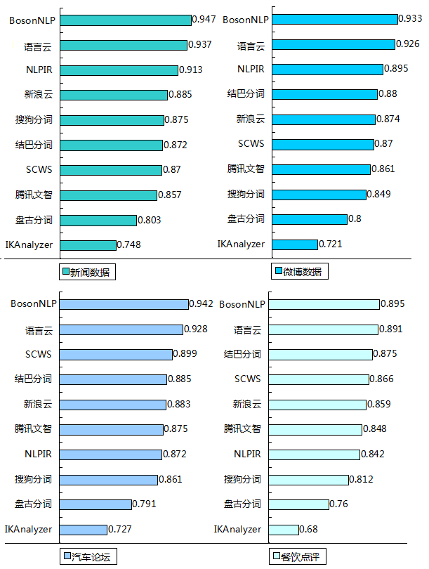 技能上,依据玻森供给的一份包含BosonNLP在内的11款敞开中文分词引擎的评测成果显现,BosonNLP的分词准确度实属上乘: