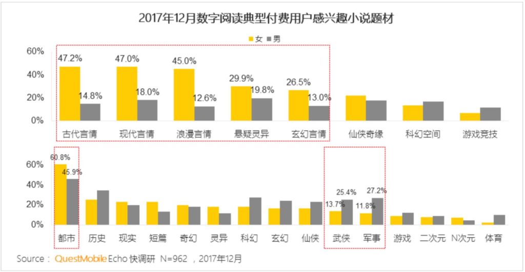 3.付费体裁:女生为言情、悬疑买单,男生为军事、武侠买单